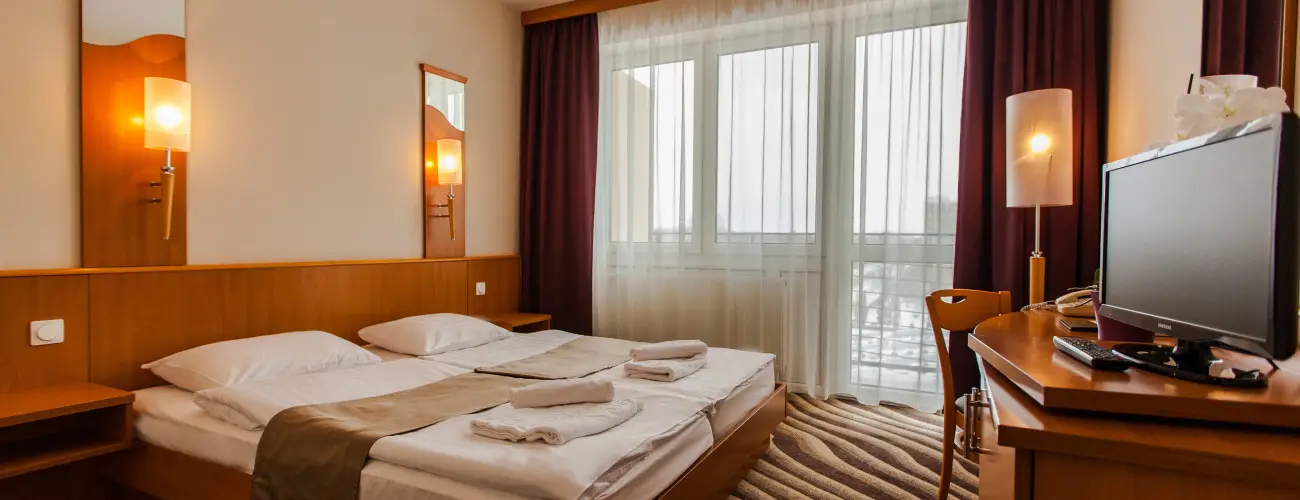A négycsillagos szálloda 140 kétágyas szobával, 8 családi szobával és 1 prémium lakosztállyal rendelkezik, amelyek berendezéséhez hozzátartozik a fürdőszoba, a kábeltévé, a telefon, a minibár, a széf, a hajszárító, valamint az Internet csatlakozási lehetőség. A fedett úszómedence, a fitness terem, kerékpározási, ping-pongozási lehetőség mellett wellness-részleg finn szaunával, fényterápiás infrakabinnal, gőzkabinnal, tepidáriummal, szanáriummal, jégkúttal, élményzuhannyal, valamint barlang-élményfürdővel várja vendégeit. A szállodában mindemellett fodrászat, kozmetika, pedikűr, szolárium és masszázsok is rendelkezésre állnak. A szálloda konferenciaközpontja kiváló helyszínt nyújthat céges rendezvények, bemutatók, továbbképzések és egyéb találkozók részére. A természetes fénnyel megvilágított konferenciatermek 350 fős és 100 fős konferenciaterem, valamint a négy darab 40 fős szekcióterem) kiváló technikai felszereltséggel rendelkeznek. A gyermekek szórakoztatására kiemelt időszakokban animátor áll a rendelkezésre, aki színes programokkal várja a gyermekeket.