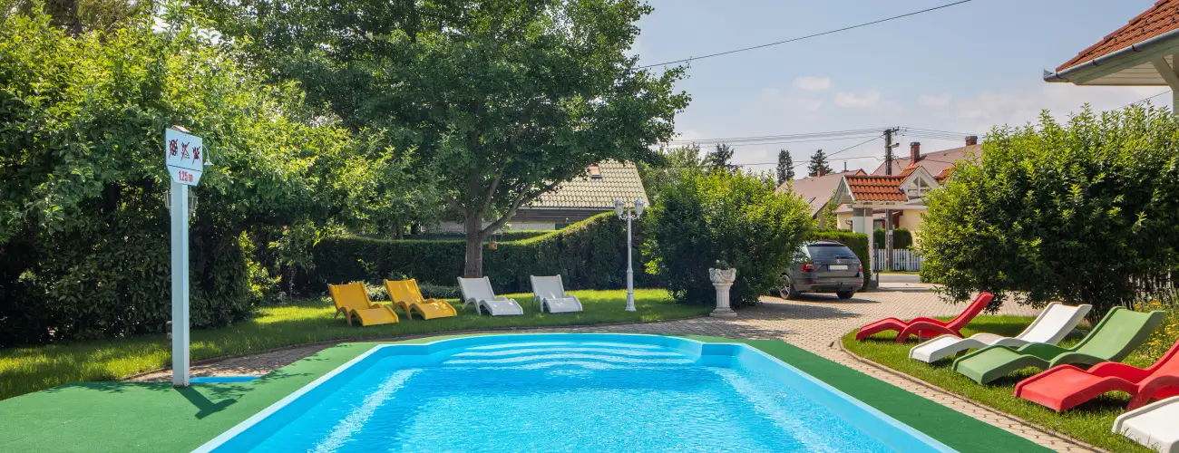 nyáron a szabadtéri medence, napozóágyak, napernyők használata